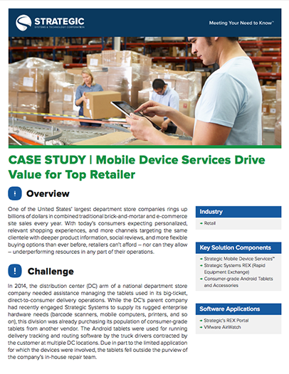 Learn how Strategic Systems helps manage a large retailer's population of more than 700 tablets, plus accessories, and with keeping them provisioned and in circulation across more than 20 different locations. Benefits include: improved communications, faster device turnaround, and improved location and contractor accountability.